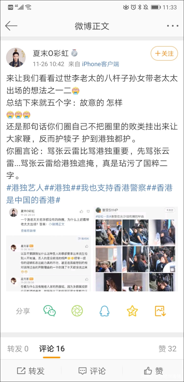 某些個粉絲説你們説張雲雷就是包庇那個京劇演員XX(我還是沒記住名字),你們就是支持港*獨???邏輯十分感人。試問不是你們這些人,誰知道那個港*獨演員啊?我説句公道話,京劇圈子裏還經常因為欣賞的角兒不一樣總掐架,誰會在意一個誰都沒聽説過的人發過的微博啊???更何況上次我看也沒多少粉。大家為什麼説張雲雷,因為他現在不僅在相聲圈裏了,基本能算個明星了吧,妥妥的公眾人物了吧。既然享受公眾人物給自己帶來的福利,也要承擔作為一個公眾人物應該承擔的責任。什麼話能説,什麼話不能説是最基本的道理。