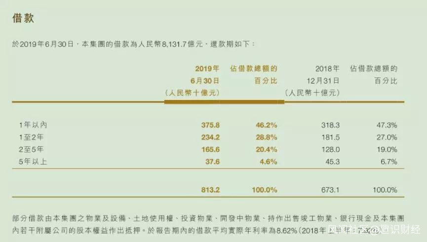 財報顯示,截至2019年6月30日,恒大借款8131億元,相較2018年底的6731億元,淨增1400億元,增長21%。而且,報告期內借款成本(平均年利率)為8.62%,高於2018上半年的7.92%。