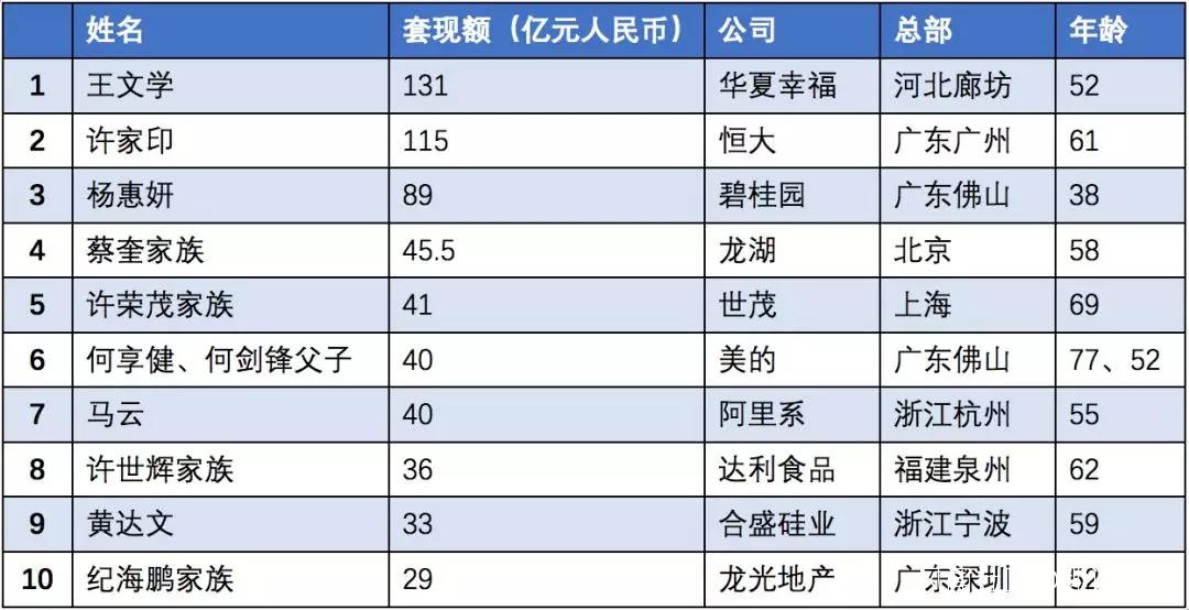 其中,華夏幸福王文學與恒大許家印,分別套現131億元、115億元,位列冠亞軍。緊隨其後的是碧桂園楊惠妍,龍湖蔡奎家族以及許榮茂家族。