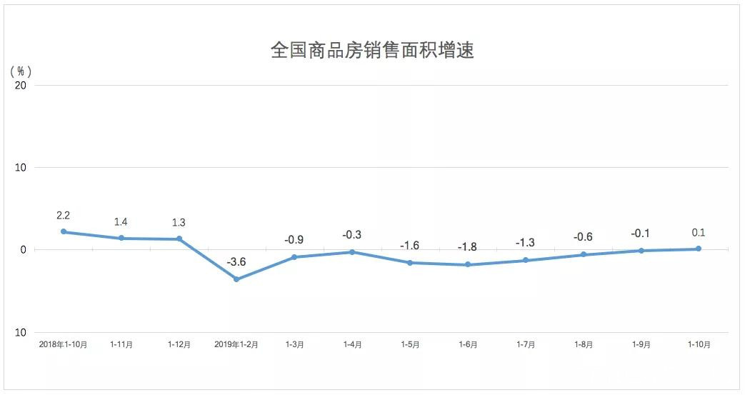 數據顯示,2019年1—10月,全國商品房銷售面積133251萬平方米,今年以來增速首次由負轉正,同比增長0.1%;這一數據,1—9月增速為-0.1%。