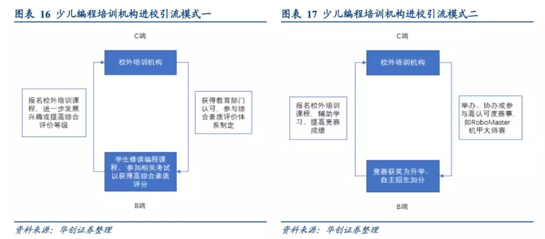 華創證券指出,目前編程機構進公立校的模式主要分兩種:其一是通過舉辦學校認可的編程賽事,作為升學、招生的特定通道。另一種模式則與學校有更深度的合作,即通過相關課程向中小學輸出,在學校選拔的邏輯下形成“校內引流,校外招生”的模式。