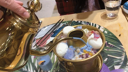 先往銅鍋中央倒入發散仙氣的液氮,再淋上一圈冒着橡皮泥味的藍色椰奶。