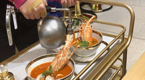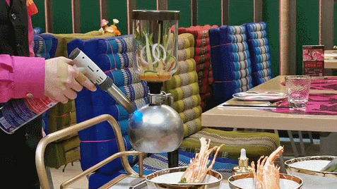 比如虹吸壺冬陰功,店員舉着噴槍在虹吸壺四周加熱,湯汁在壓強的作用下徐徐上升,浸泡住玻璃瓶裏的數種香料。