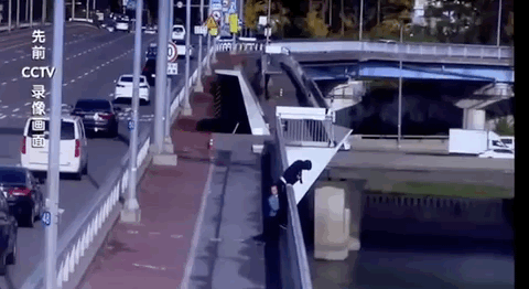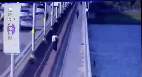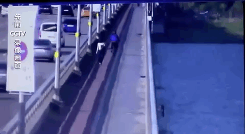 據CCTV錄像畫面顯示,韓國一座橋上,一位穿帽衫的年輕人,站在欄杆上,想輕生,一位年長者將他攔腰抱下,不停安撫。