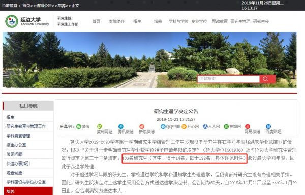 近日,延邊大學發佈了一條《研究生退學決定公告》,對該校136名研究生送達退學決定書,原因是“超過最長學習年限”。其中,博士14名,碩士122名。