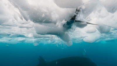 因為沒有足夠的冰面支撐它們的活動,它們被逼無奈,不得不下海,但這正好給海豹帶來了便利。