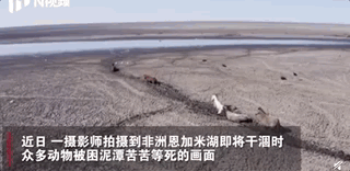 因為即將枯竭,泥土的水分還沒有完全蒸發,所以困住了很多前來尋找水源的動物。