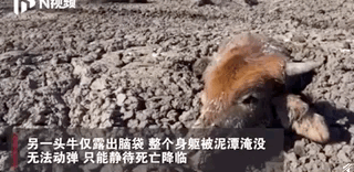 一隻剛出生還沒多久的小牛,同樣被快乾涸的泥土掩埋,它越動彈就越陷越深。