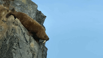 但海獅有多麼笨重,我們都知道,離開了水,它們寸步難行,更何況要爬崖。