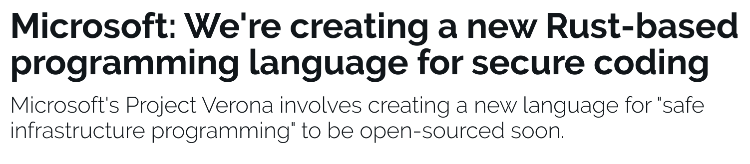 Matthew 提出了微軟正在開發的基於 Rust 的新編程語言 Verona,他表示這是首次討論該項目,Verona 是用於微軟“安全基礎設施編程(safe infrastructure programming)”的一種新語言。
