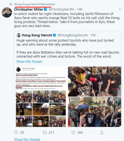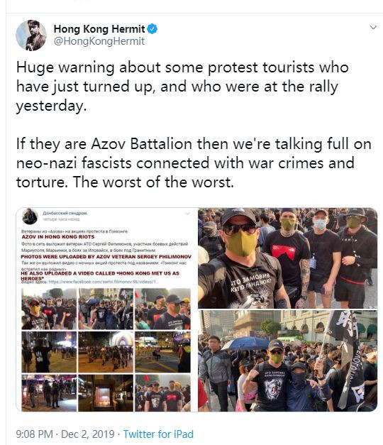 這一消息也得到了另一個境外社交平台“推特”上一些“大V”和“記者”的確認。比如一直活躍在香港的英文圈,並支持香港黑衣蒙面人的自由撰稿人@HongKongHermit,就發帖表示香港街頭確實來了一羣烏克蘭的極右翼新納粹分子。