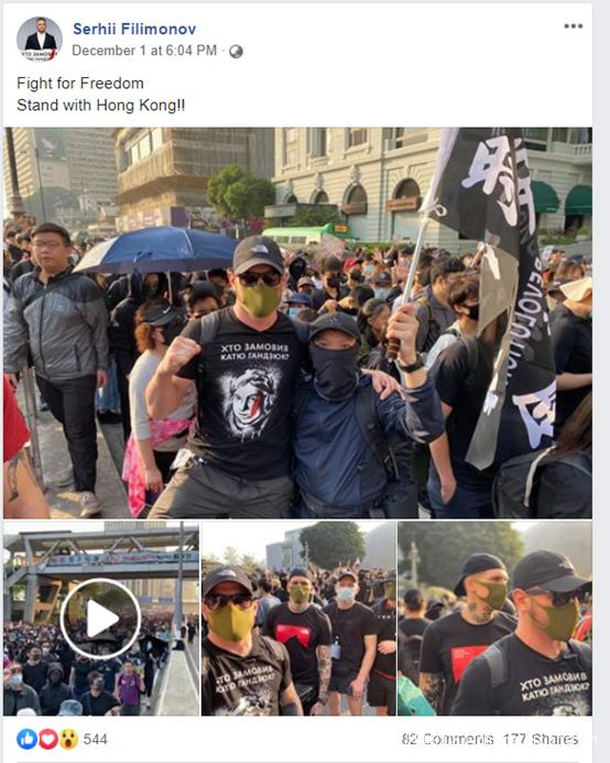 從這個Serhii Filimonov在境外社交網站“臉譜網”(Facebook)上發佈的貼文來看,這夥烏克蘭的新納粹分子,至少從12月1日起就已經來到了香港。他們此行的目的則是“支持”香港街頭那些不斷搞破壞和傷人的黑衣蒙面人。