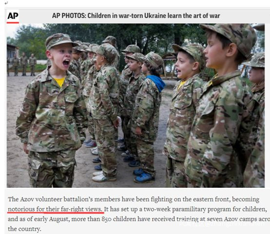 美聯社2017年的一篇報道更指出,“阿佐夫營”(Azov Battalion)等烏克蘭的極右翼新納粹民兵組織,甚至還開設了面向兒童的軍事訓練營,從小就向孩子灌輸新納粹的思想。