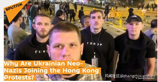在這篇題為“為啥烏克蘭的新納粹分子會加入香港街頭的抗議”的報道中,俄羅斯衞星通訊社指出,這些脖子上紋着“納粹標誌”、出現在香港街頭的4名烏克蘭男子,是2014年烏克蘭“顏色革命”政變期間,被美國CIA豢養出的一羣極右翼新納粹民兵組織“阿佐夫營”(Azov Battalion)和“右部”(Right Sektor)的成員。