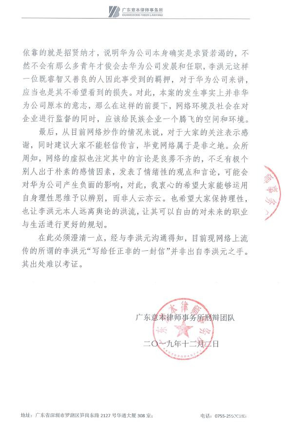 12月2日,李洪元的代理律師、廣東意本律師事務所律師謝連喜向澎湃新聞(www.thepaper.cn)發來一份《聲明》,《聲明》中提及,經與李洪元溝通得知,目前網絡流傳的所謂的李洪元“寫給任正非的一封信”並非出自李洪元之手,其出處難以考證。