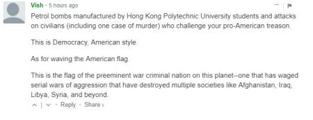 Vish指出,香港學生製作汽油彈,並用來攻擊反對其親美叛國思想的普通市民。這也算民主,但只不過是美式民主。至於他們揮舞的美國國旗,這是世界知名犯戰爭罪國家的國旗。美國曾經通過一系列的侵犯戰爭毀掉了阿富汗、伊拉克、利比亞、敍利亞等國的社會。