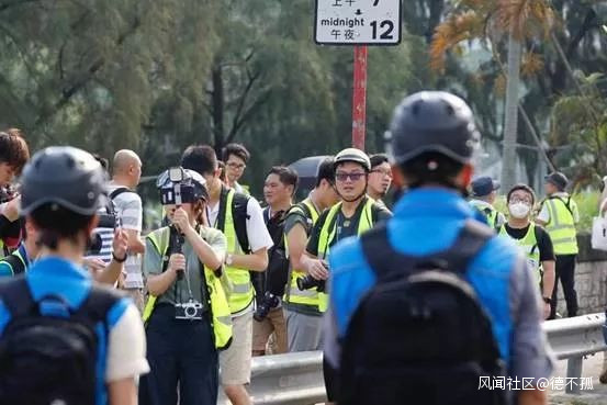 港警藍衣傳媒聯絡隊員面對身穿黃色反光背心的記者。圖源:香港警察傳媒聯絡隊