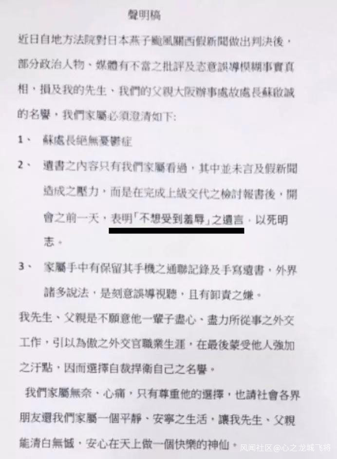結果,在2018年9月14日這天,台灣派駐大阪代表處的“外交人員 ” 蘇啓誠,因不堪這種羞辱選擇自殺身亡……