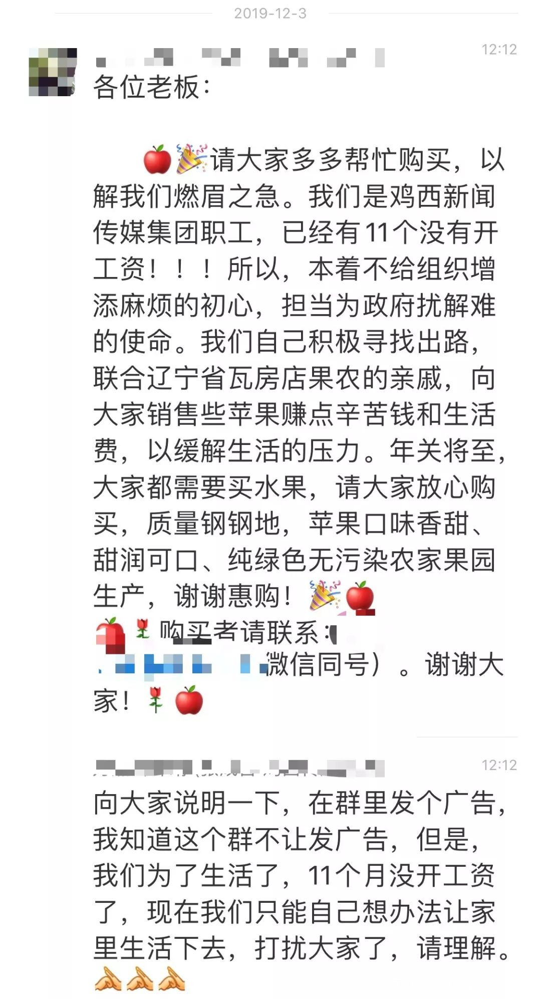 這則廣告由一位自稱是雞西新聞傳媒集團職工的人士發出,他表示雞西新聞傳媒集團已拖欠其11個月工資,現在自謀生路,想通過幫助親戚分銷蘋果的方式緩解生活壓力,希望能夠得到大家的惠顧。
