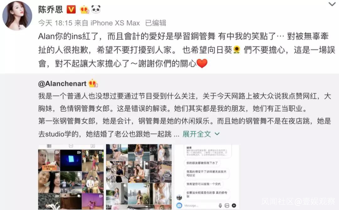 事情還沒結束。傍晚,艾倫發了微博澄清了關於ins點贊大胸美女的事情。稱被陳喬恩粉絲扒出的幾位美女都是他的朋友,鋼管舞和內衣都是她們的業餘興趣,而與美女約高爾夫只是因為是她的老師。隨後,陳喬恩轉發了男友的澄清,力挺男友,並對被牽扯到的人表示抱歉。