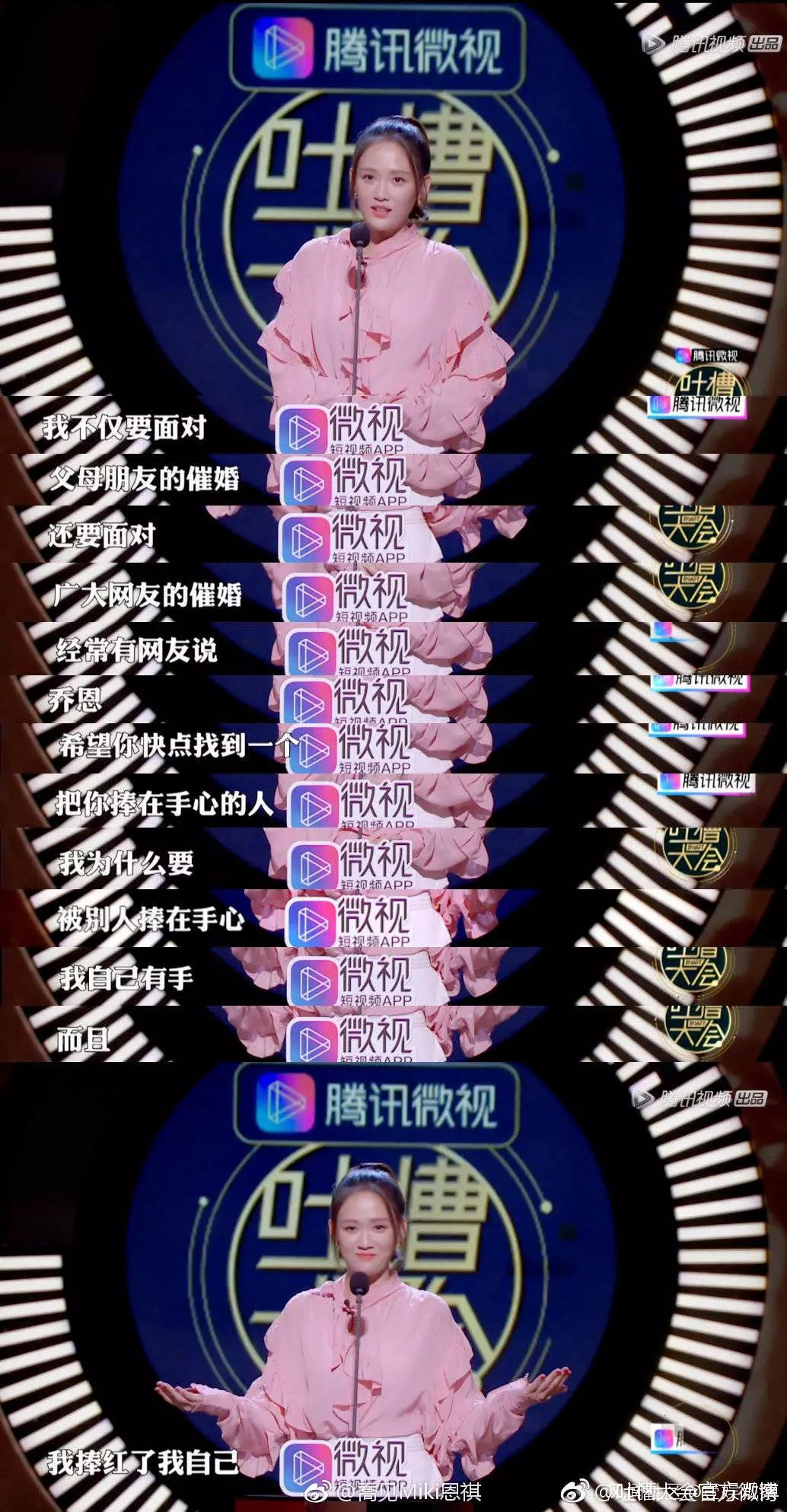在《吐槽大會》中,她就曾自嘲自己的感情狀況,“不憧憬穿婚紗,因為在偶像劇裏就結了幾百次婚”,“不需要被人捧在手心,我自己有手,我捧紅了自己”。
