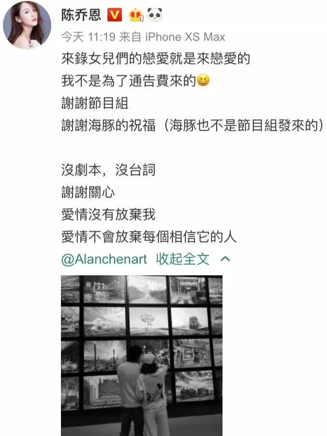 遇到艾倫,陳喬恩説,“愛情沒有放棄我”。字裏行間能感受到她遇到愛情的“好不容易”。