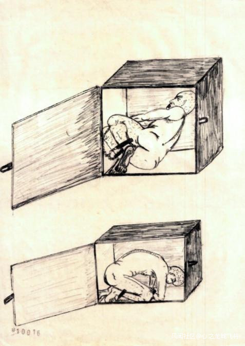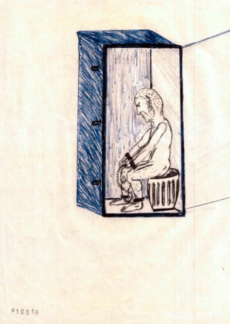 除了這些,中情局還有很多幽閉的方法。其中一張圖是祖巴伊達光着身子、剃光了頭,戴着腳鐐坐在一個被用作廁所的桶上。“我發現自己完全陷入黑暗中,只能坐在桶上,因為那裏(隔間)太狹窄”。