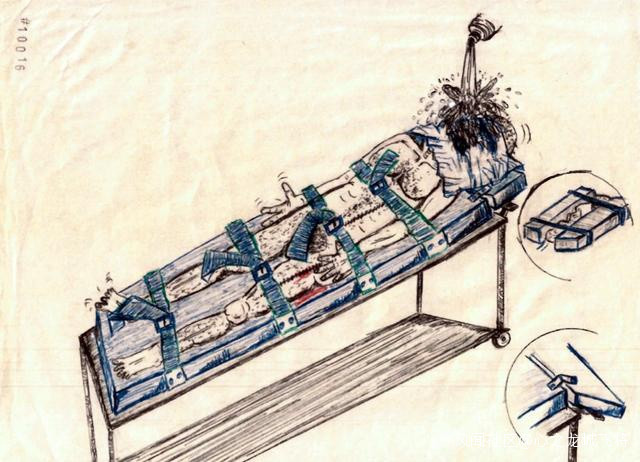 據悉,祖巴伊達是已知的第一個被中情局施水刑的人,一共遭受83次。在一副畫中,他裸體被綁在一塊木板上,當水倒在他被布矇住的臉上時,他的右腳因痛苦而扭曲。