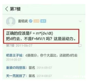 物理民科是最多的。一半人試圖推翻萬有引力定律、相對論,建立屬於自己的物理大廈。但就連最簡單的公式F=m·a=m·dv/dt,他們都能把d給約掉!