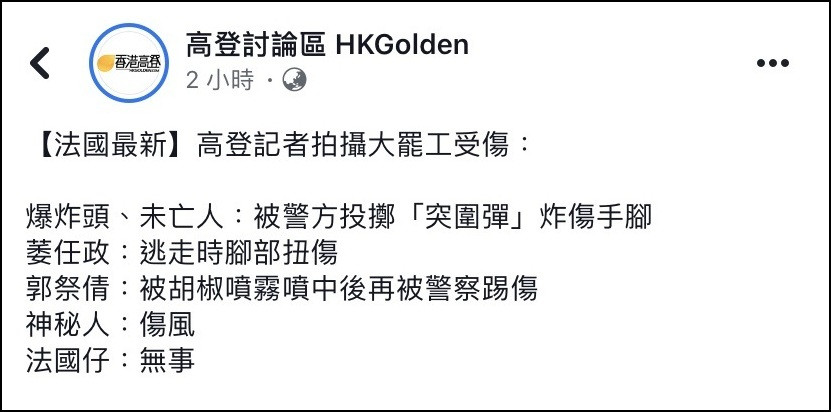 據瞭解,北京時間6日早上,有大批極端網民聚集的“高登討論區”在其臉書賬號上爆料稱,自己派駐在法國示威現場的兩名記者遭警方投擲突圍彈擊中受傷。