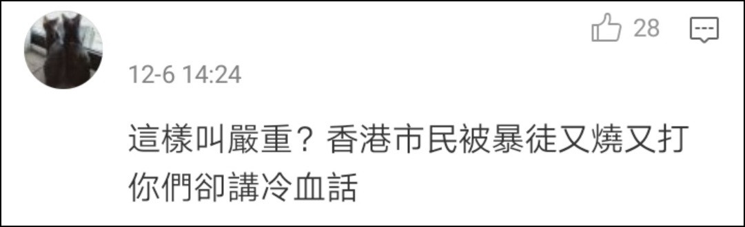 對於兩名記者受傷一事,許多內地網友紛紛表示:“知道香港警察多剋制了吧”,“就這樣也好意思叫做‘嚴重受傷’,問過香港街頭那些被暴徒毆打流血的無辜市民了嗎”。