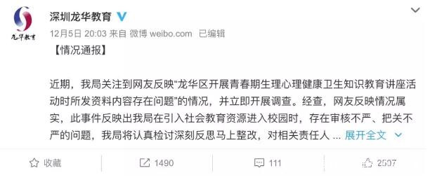 12月5日晚間,深圳市龍華區教育局發佈通報稱, 網友反映的教育講座活動屬於“醫教家結合,共育祖國未來--青春期生理心理健康教育”項目,具體內容為面向4-9年級學生、家長及教職工開展青春期生理心理健康衞生知識教育講座,時間從2019年6月至2020年5月為期一年。執行單位為深圳市龍華區協愛婦女兒童健康促進會。