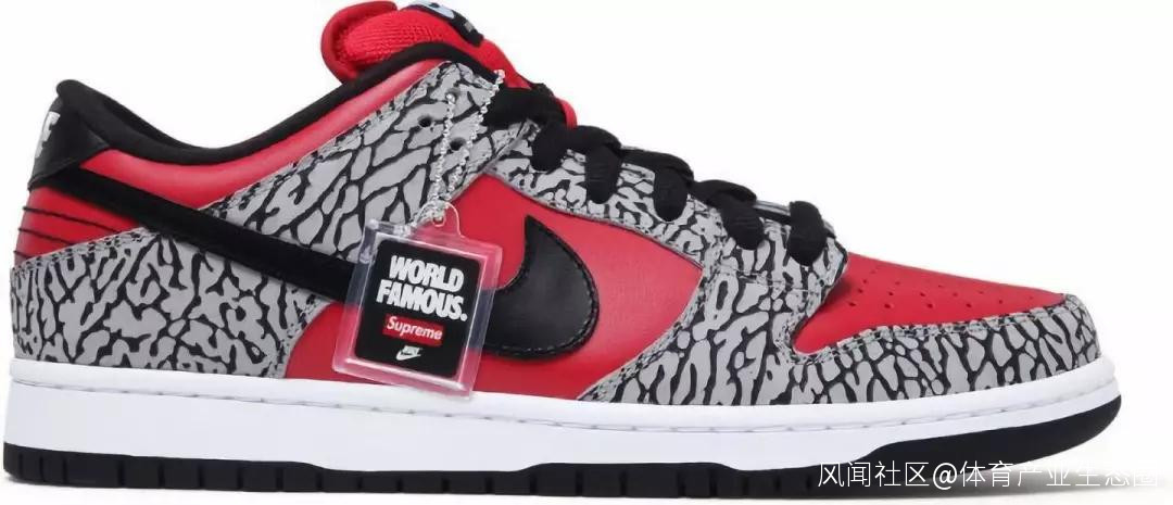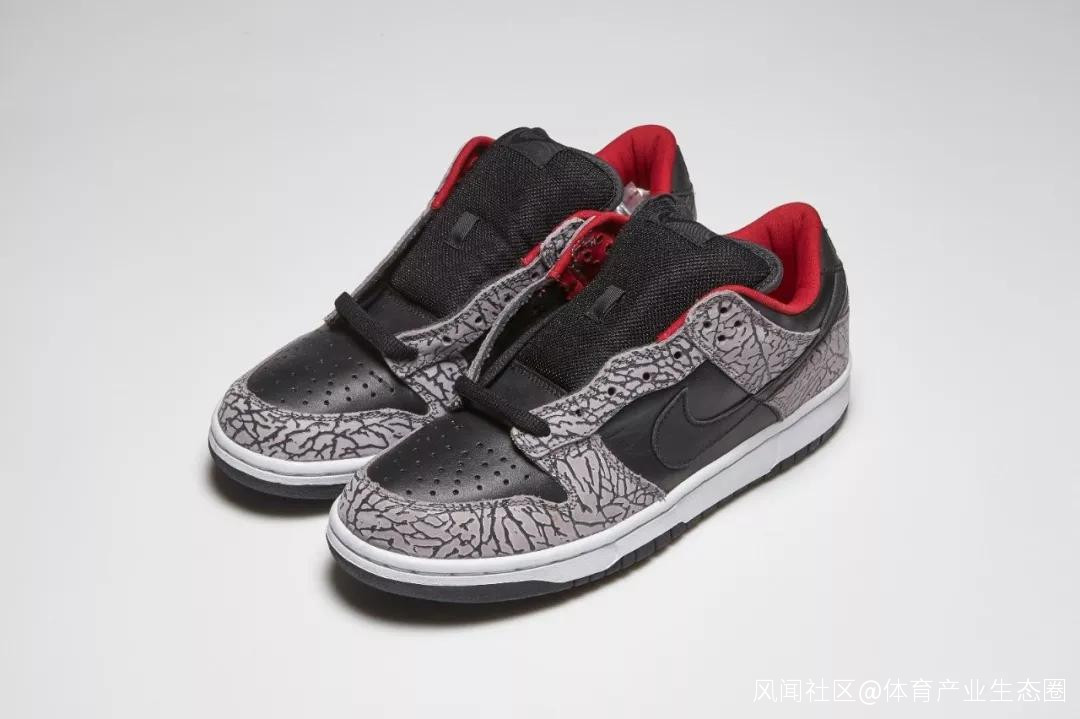 於是,一款以AJ3爆裂紋為主的SB Dunk Low橫空出世。雖然這款鞋當時沒有大賣,但在口碑上收穫了成功。更重要的是,這雙鞋的發售不僅代表了Nike 滑板部門的野心,也宣告了Nike X Supreme合作的開始。