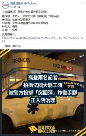 香港“黃媒”“高登討論區”發佈消息稱,他們有多位記者在採訪法國大罷工時受傷,其中一名是“被胡椒噴霧噴中後再被警察踢傷”,還有兩名則是“被法國警方投擲的“突圍彈”炸傷手腳,正入院治療”。留言區內大批黑色頭像的網民大罵法國警方是“黑警”。