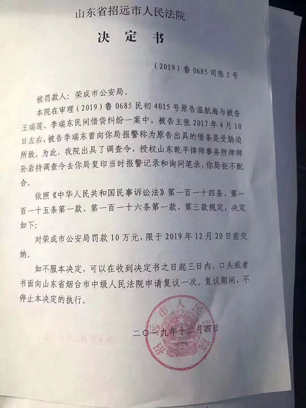 該決定書顯示,依照《中華人民共和國民事訴訟法》第一百一十四條、第一百一十五條第一款、第一百一十六條第一款、第三款規定,決定如下:對榮成市公安局罰款10萬元,限於2019年12月20日前交納。