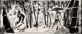 我們主要想用傘的橘黃色,在綠的竹林裏,打開的時候特別好看,然後傘裏還能抽出一把劍,覺得畫面上挺帥的。
