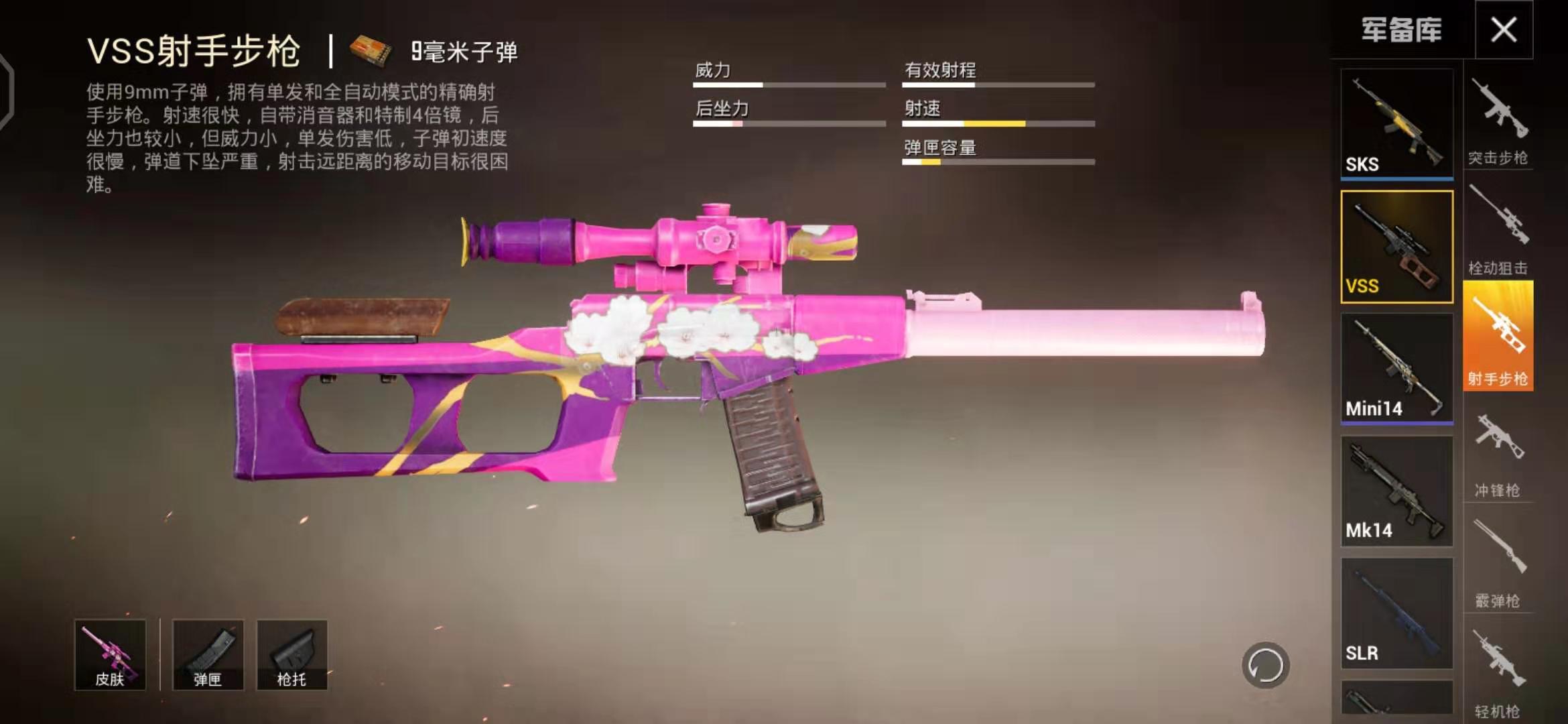 如同很多玩家不捨得自己用AWM和GROZA一樣,VSS其實也挺容易被大家冷落。關於VSS,研究所前面的文章已經反覆提高過了,推薦VSS的原因在於:靜音+高秒傷。