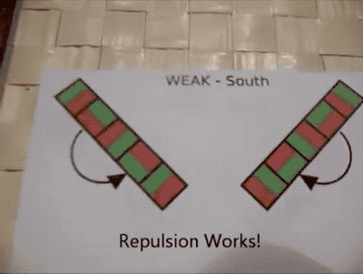 像下面這樣子交錯排布磁鐵的南北極,然後把它們固定住,就可以增強磁場,製造出一個電磁炮啦!