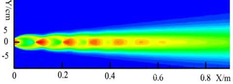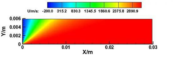 當火箭飛行高度逐漸增高時,周圍大氣逐漸稀薄,火箭噴流和大氣混合作用的結果是馬赫盤數目逐漸減少,最後消失,噴流充分膨脹,與大氣混合後會形成迴流區,尾流徑向直徑變大,軸向長度變長,形成高空雨傘結構。高空尾流流場可用稀薄氣體動力學建模,其典型速度雲圖如下所示: