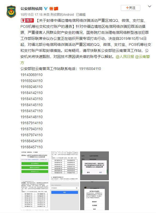隨後,@公安部刑偵局 於 10 月 15 日下午通過微博發佈了《關於封停中緬邊境電信網絡詐騙活動嚴重區域QQ、微信、支付寶、POS機等社交和支付賬户的通告》,表示正在組織開展專項打擊行動,被“誤傷”的用户可以在聯繫並核實後解封: