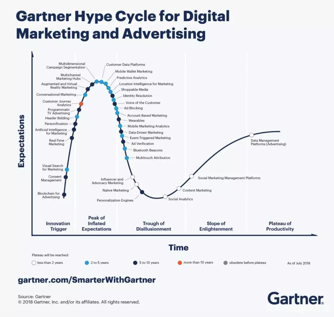 所以Gartner數字市場廣告技術成熟度曲線上明確繪製了各種面向下一個世代的廣告技術——這些技術其實在為美國廣告市場保駕護航。