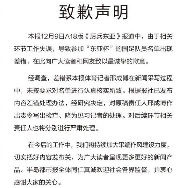 “本報12月9日A18版《厲兵東亞》報道中,由於相關環節工作失誤,導致參加"東亞杯"的國足隊員名單出現差錯,在此向廣大讀者和網友致以最誠摯的歉意。經調查,差錯系本報體育記者邢成博在新聞採寫過程中,未按要求對名單進行認真核實所致。根據報社已發佈內容差錯處理辦法,經研究決定,對原稿責任人邢成博作出責令寫出檢查、降為見習記者的處理。對後續環節相關責任人也將分別進行嚴肅處理。在今後的工作中,我們將持續加大采編作風建設力度,切實把好內容發佈關,為廣大讀者呈現更多更好的新聞產品。半島都市報全體同仁真誠歡迎社會各界監督,並衷心感謝大家的關心。”