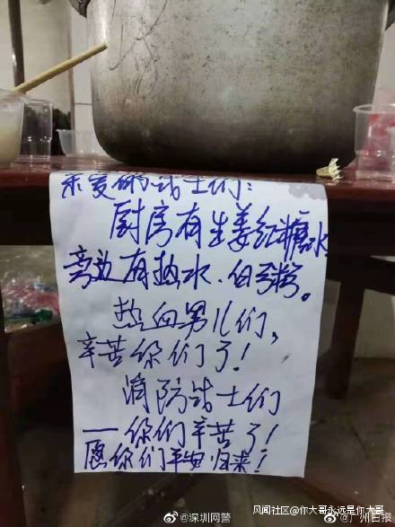 在一間空無一人的平房裏,武警官兵們看到了一張紙條:“親愛的戰士們,廚房有生薑紅糖水,旁邊有熱水、白粥,熱血男兒們,辛苦你們了!消防戰士們,辛苦你們了!願你們平安歸來!”