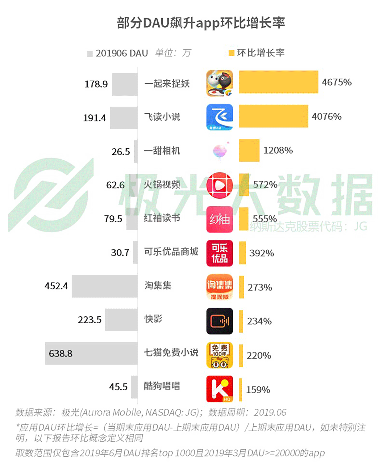2019年6月部分DAU飆升app環比增長率(圖片來源:極光大數據)