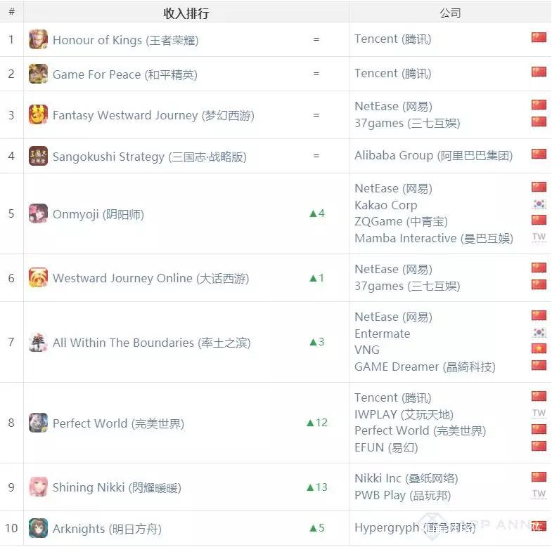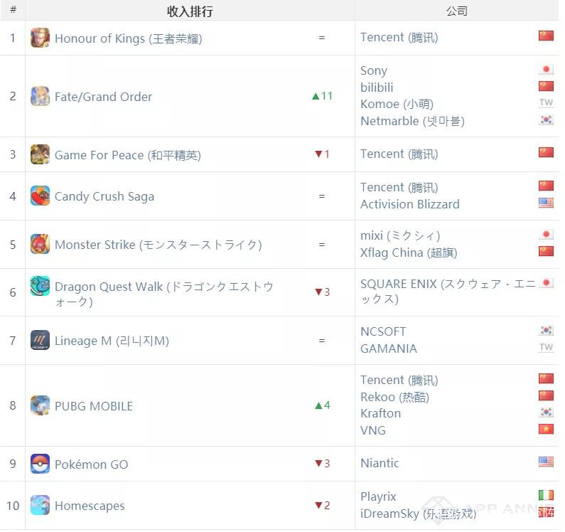 全球收入榜TOP 10,只有FGO和PUBG有排名上升