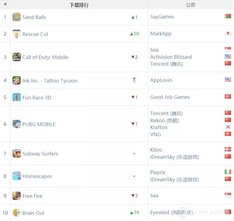 再看全球下載榜方面,《Rescue Cut(救救寶寶)》、《Ink Inc.(紋身公司)》、《Brain Out(腦洞大師)》三款超休閒類遊戲新晉TOP 10。其中從10月推出的《Rescue Cut》在11月通過買量推廣,成功風靡美、英、日等市場,一度登頂美國免費榜,此外還在近20個國家與地區市場排名第1。而《腦洞大師》作為一款中國廠商推出的魔性益智遊戲,11月期間在美國、加拿大、英國、德國、日本等市場都取得過不錯成績,但目前在國內的熱度一般。