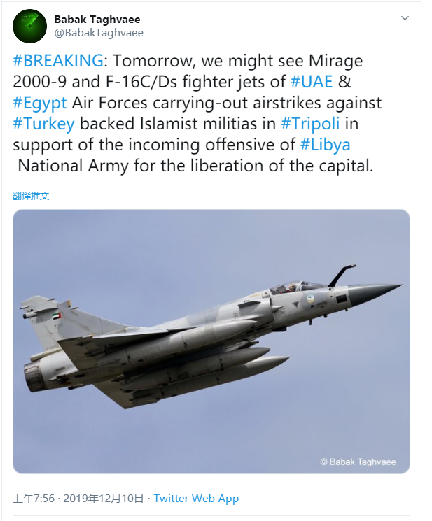 長期在利比亞保持“代理人戰爭”的阿聯酋,終於親自下場了。一併下場的還有埃及。12月10日,阿聯酋和埃及發佈聯合聲明,聲稱明天將會出動幻影2000戰機和F-16戰機,聯合起來對“盤踞在的黎波里的ISIS分子”進行轟炸。