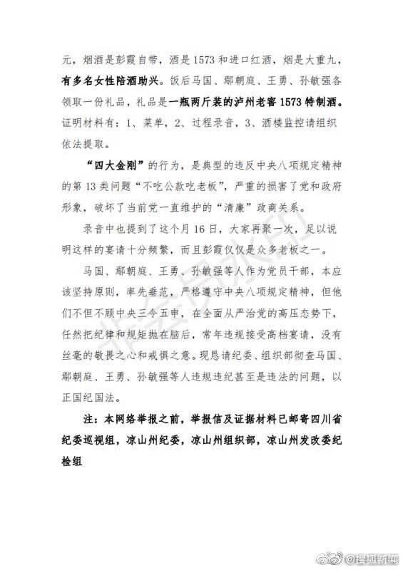 該舉報稱,涼山州發改委四名幹部因獲組織擬晉升提拔,於2019年9月5日下午,在涼山州西昌市高檔酒樓“隨園”醉月包間,接受了當地一名企業老闆的預祝宴請。舉報稱,宴席上煙酒是請客的企業老闆自帶的1573和進口紅酒,以及大重九香煙。該微博公佈的菜單顯示,煙酒外當日總共消費是1888元。
