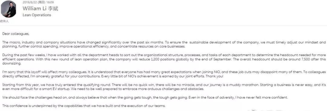 8月22日,李斌發內部信承認了裁員的發生,並將繼續縮減2500人。一個月之後,蔚來發布了2019年第二季度財報,營業淨虧損同比擴大83.1%,至32.858億元。此時的蔚來,相比去年巔峯市值的119億美元,市值已經蒸發超90億美元。