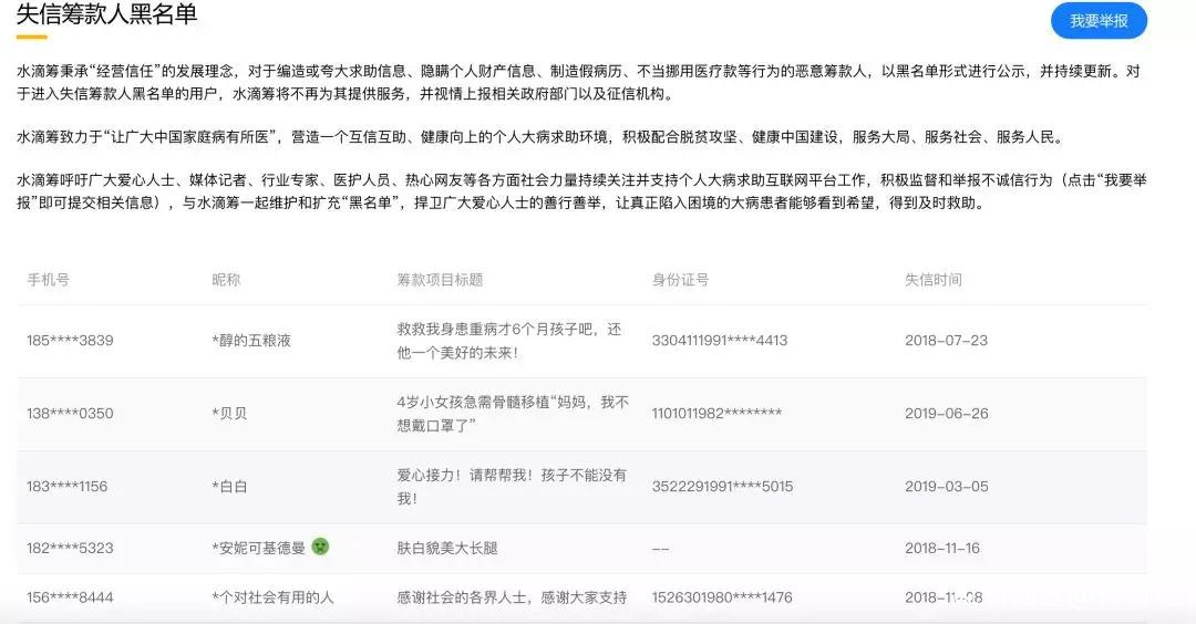 水滴籌公佈的失信籌款人黑名單,圖片源自水滴籌官網